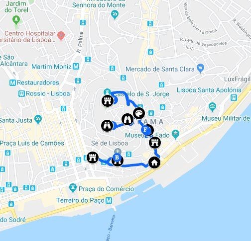 1 - Sé Cathedral 2 - Miradouro das Portas do Sol 3 - Miradouro da Nossa Senhora do Monte 4 - Church of São Vicente 5 - National Pantheon 6 - Alfama